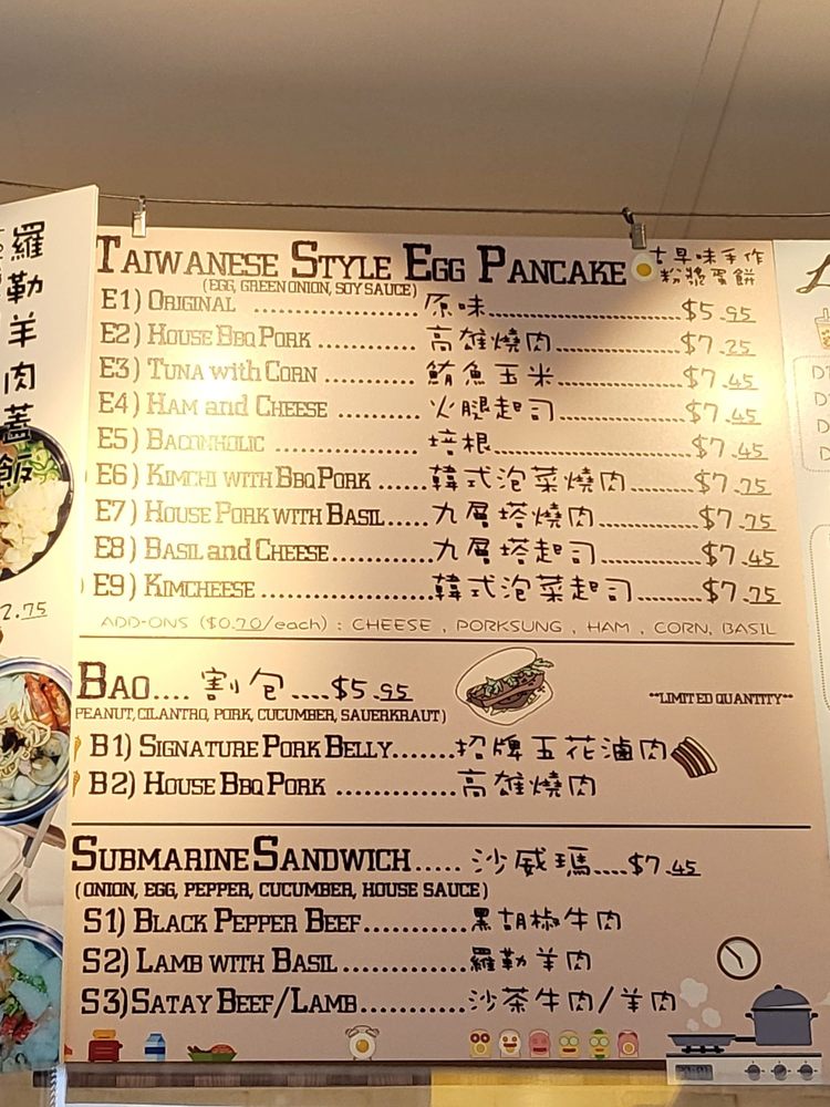 Taiwanese style egg pancake with green onion, egg, house soy sauce, cucumber and your flavors.
